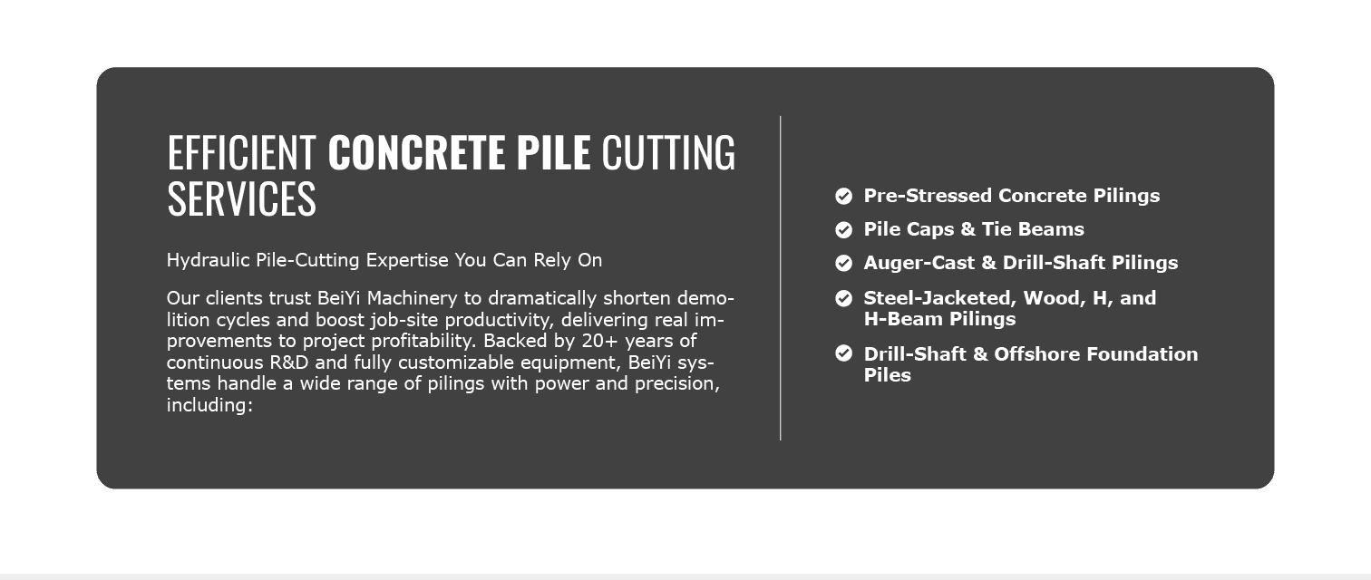 Rely on BeiYi Machinery to provide all-inclusive, fully customizable equipment packages for your piling and foundation projects. Backed by over 20 years of pile-cutting expertise and engineering experience, our packages include high-performance hydraulic cutters, accessories, and support tools designed for maximum efficiency, reliability, and safety. With BeiYi, your projects run smoothly from start to finish — and our team can tailor each package to meet your specific site conditions and project requirements, helping you cut faster, work safer, and save more.